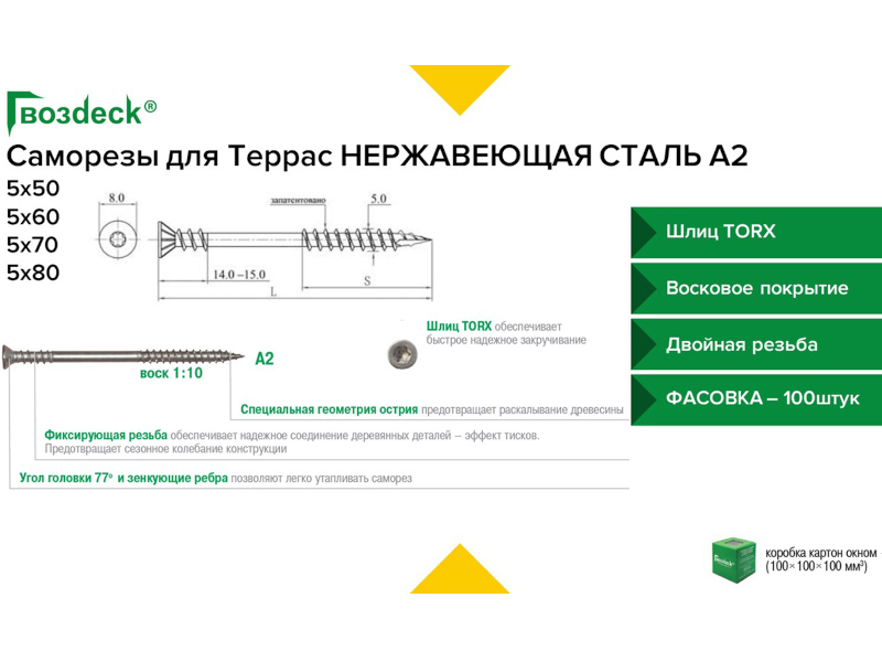 Саморез 5*60 Гвоздэк для террасной доски потайной Torx25 (100шт/уп.)