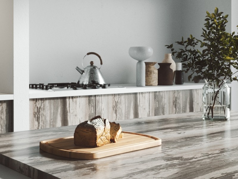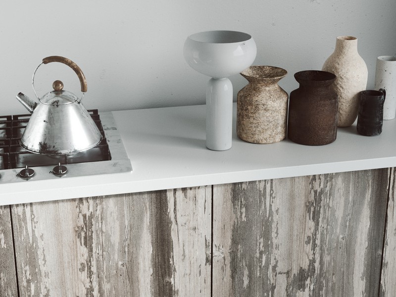 Матовая поверхность с хаотично расположенными рельефными вкраплениями гармонично дополняет поверхности с древесными репродукциями.
