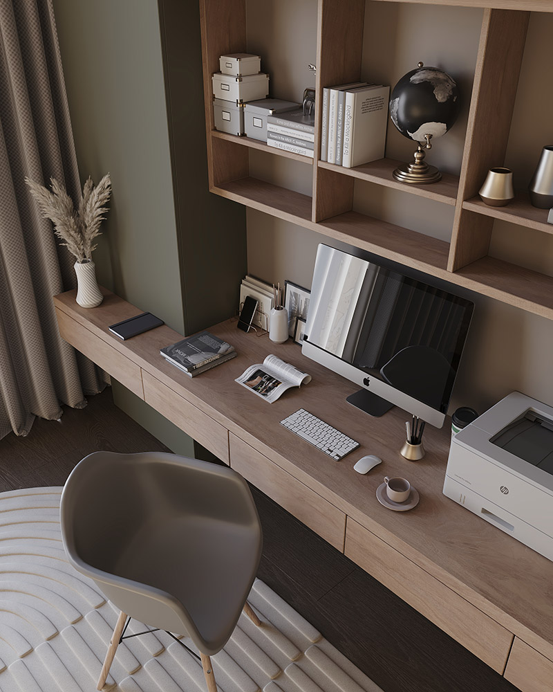 Матовая поверхность с хаотично расположенными рельефными вкраплениями гармонично дополняет поверхности с древесными репродукциями.