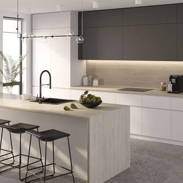 Ультрамодные декоры: репродукции древесины, кожи, текстиля, керамики, мрамора и металла. Оригинальный рисунок декора гармонично сочетается с рельефной структурой столешницы.Современный формат R3 с радиусом загиба 3мм. Пластик равномерно покрывает поверхность столешницы, создавая плавный и бесшовный переход.