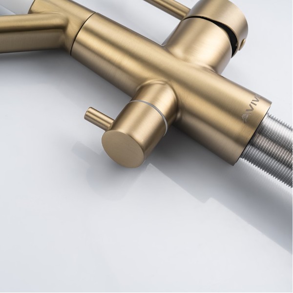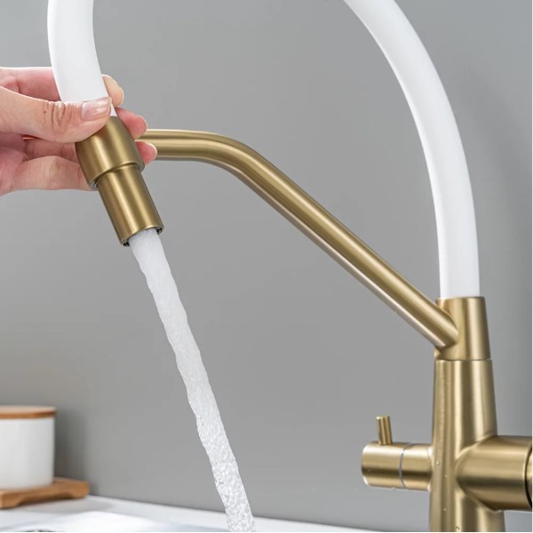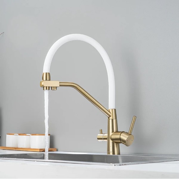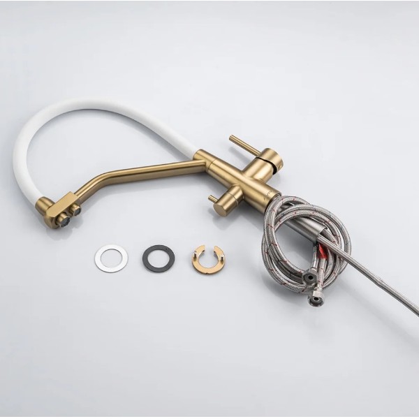 Смеситель кухонный Avivacom с гибким изливом и фильтрацией, золото/белый
