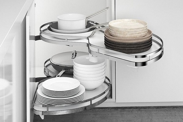 В данном случае движение фурнитуры осуществляется внутри ящика по часовой стрелке. Деление на отсеки и круговое вращение прекрасно подходит для хранения кастрюль, сервизов и сковородок.